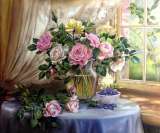 Товары со скидкой % «Букет и желтых и розовых роз на столе вмести с черникой» 40x50 см